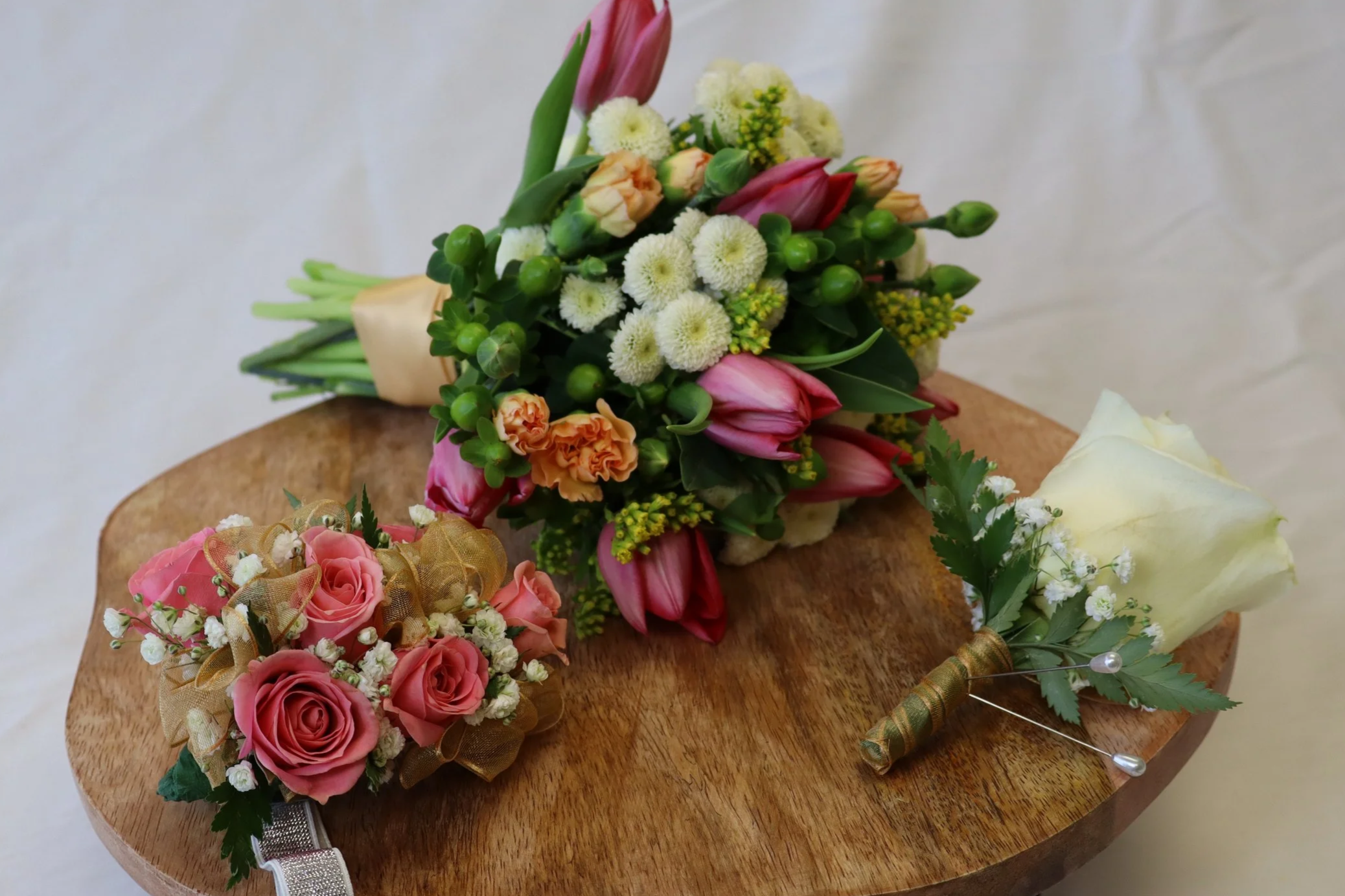 A classic rose corsage featuring spray roses in your chosen color, accented with baby’s breath and fresh greenery. Thoughtfully designed in Sacramento with ribbon and wristlet or pin options—perfect for proms, school dances, and special celebrations.
